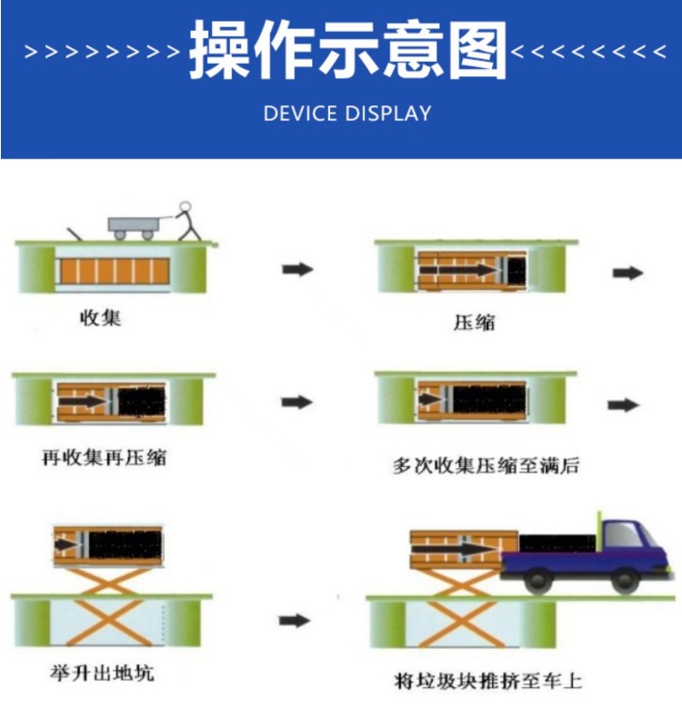 ◇平穩(wěn)可靠:兩側(cè)舉升,剪叉跨度大,升降平穩(wěn),無傾斜; ◇淺地坑:地坑深度僅為1.55m,保潔及維修極為方便; ◇高效率:壓實(shí)每噸垃圾時間≤10min; ◇全封閉水平壓縮:采用水平壓縮方式,垃圾壓縮密度≥0.86t/m3,垃圾壓縮后體積大大減小,從而大幅度提高轉(zhuǎn)運(yùn)車輛裝載量和轉(zhuǎn)運(yùn)效率,降低垃圾處理、轉(zhuǎn)運(yùn)等費(fèi)用; ◇動作少,故障率低,整套設(shè)備的垃圾壓縮、裝車由三個動作完成,簡單實(shí)用,各動作之間安全互鎖,防止操作人員誤操作造成安全事故,安全可靠; ◇垃圾儲存、壓縮及寄存全部在地面以下,地面上沒有垃圾散落,對環(huán)境影響較小,環(huán)保性好;垃圾壓縮后密度高,水份少,可避免汽車運(yùn)輸中的垃圾散落、污水滴漏現(xiàn)象,避免二次污染; ◇土建費(fèi)用低,占地面積小,可以不蓋大型工作間,既節(jié)約了投資,也縮短了工期; ◇留有專門的維修窗口,維修保養(yǎng)方便; ◇設(shè)有固定式操作和遙控器兩種操作模式,方便實(shí)用; ◇自動化程度高,可大幅提高工作效率,降低勞動強(qiáng)度。